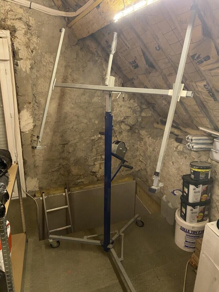 Lève plaque Mac allister très bonne état fonctionne parfaitement monté Max 3 mètres et 25 kilos Max accessoires pour pouvoir monter les plaque de 60.