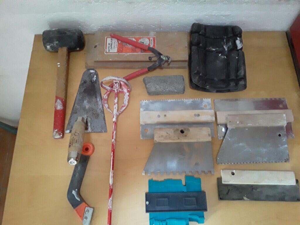 Lot pour pose de carrelage: truelle, pierre ponce pour ragréage, pince pour coupe carrelage, mélangeur etc...