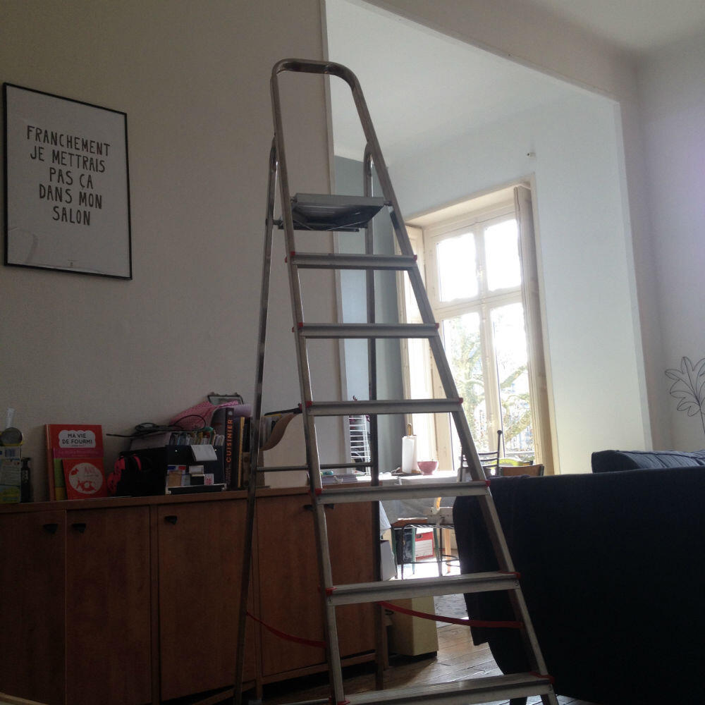 L'escabeau est en très bon état, très léger (donc facile à transporter), et me permet de monter très haut (peinture de mes plafonds à 3,70m).