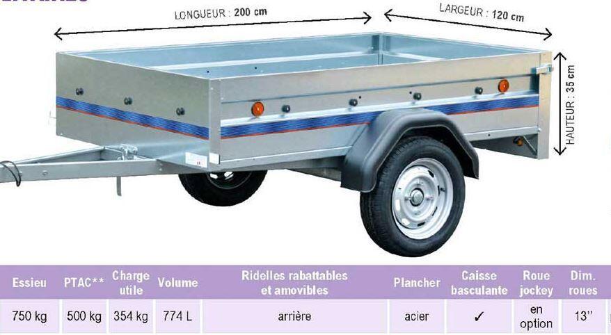 Location Loue remorque 200x120 basculante ridelle arrière rabattable à Châteauroux