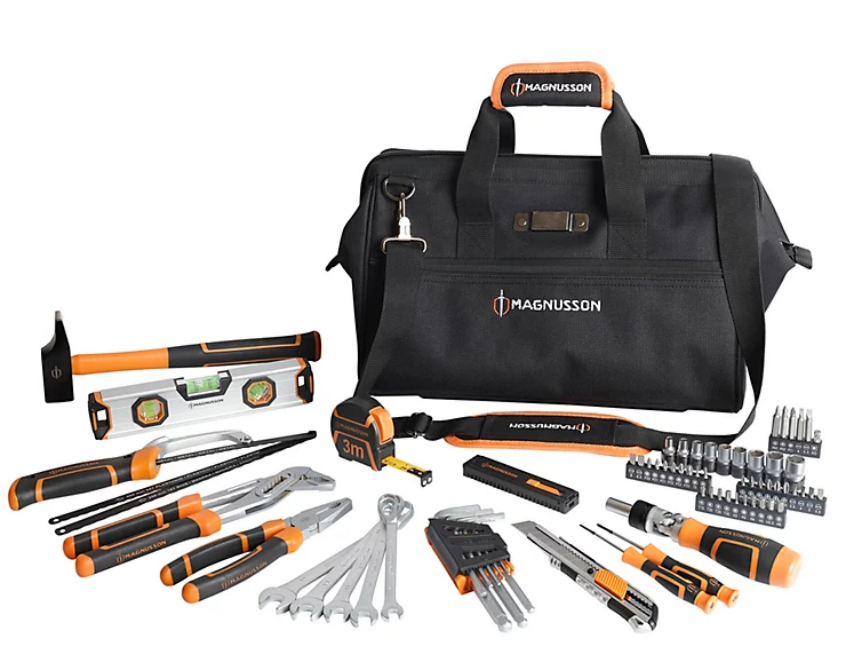 1 pince multiprise 250mm, 1 pince universelle 180mm, 1 marteau 30mm, 1 mètre ruban 3m, 1 cutter, 5 lames de cutter, 9 clés mâles, 1 niveau torpedo 250mm, 1 mini-scie à métaux avec 3 lames, 9 douilles 1/4" : 5, 6, 7, 8, 9, 10, 11, 12, 13mm, 1 tournevis porte embouts à cliquet, 31 embouts de vissage 1" S2 : PZ0, 2xPZ1, 2xPZ2, PZ3, PH0, 2xPH1, 2xPH2, PH3, SL3.5, SL4, SL5, SL5.5, SL6, SL6.5, T5, T10, T15, T20, T25, T30, H2, H3, H4, H5, H5.5, H6 ; AD, 5 embouts de vissage 2" S2 : PH1, PH2, PZ1, SL4, SL5.5, 2 tournevis de précision : PH00 et SL2, 5 clés mixtes : 8, 10, 11, 13, 14mm, sac à outils