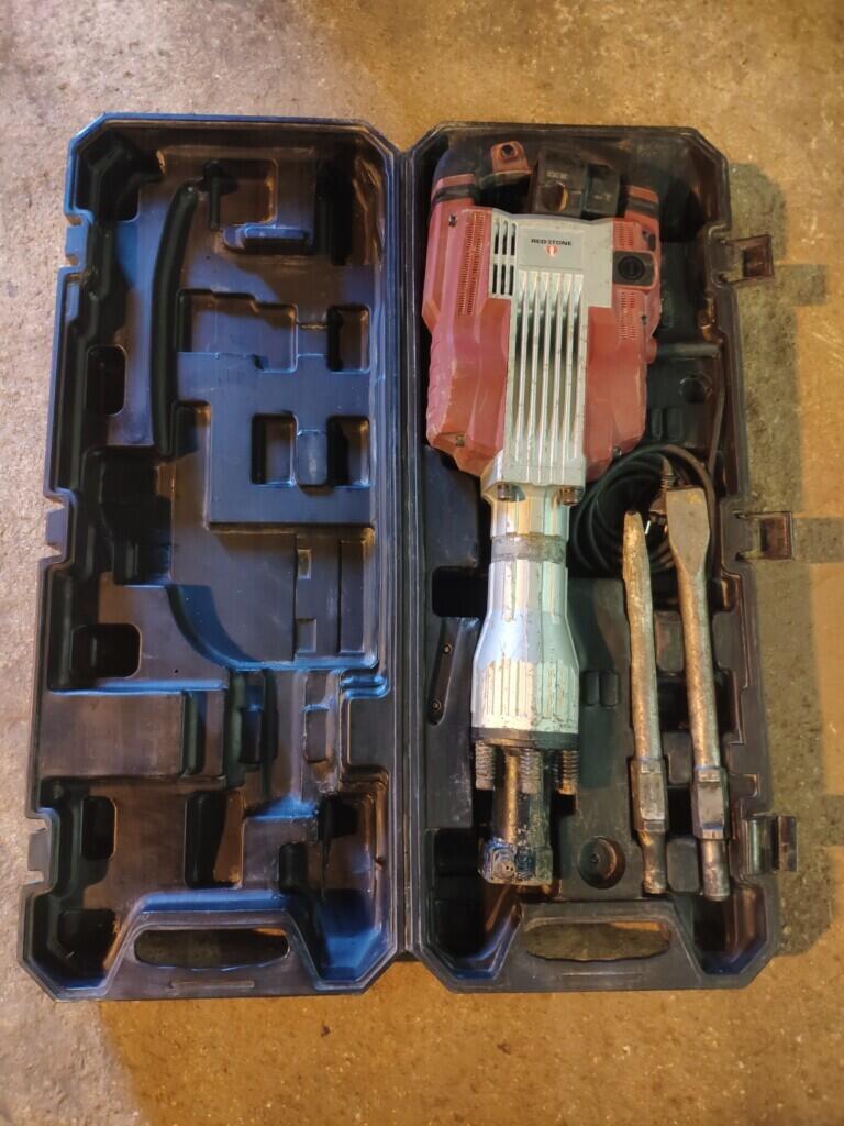 Brise béton Redstone 1750W, 45 Joules loué avec une pointerolle et un burin plat. Réservation uniquement par SMS.