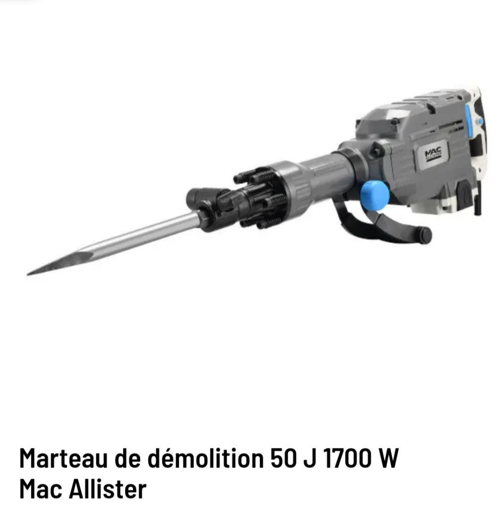 Marteau de démolition Mac Allister dune puissance de W, vous pouvez donc lutiliser également pour des travaux professionnels. Avec une force dimpact de 50 Joules et tr/min.