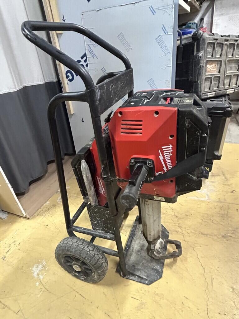 A louer marteau piqueur Milwaukee avec deux batteries et un chargeur ainsi que deux burins pointeaux et plat et le chariot de transport.