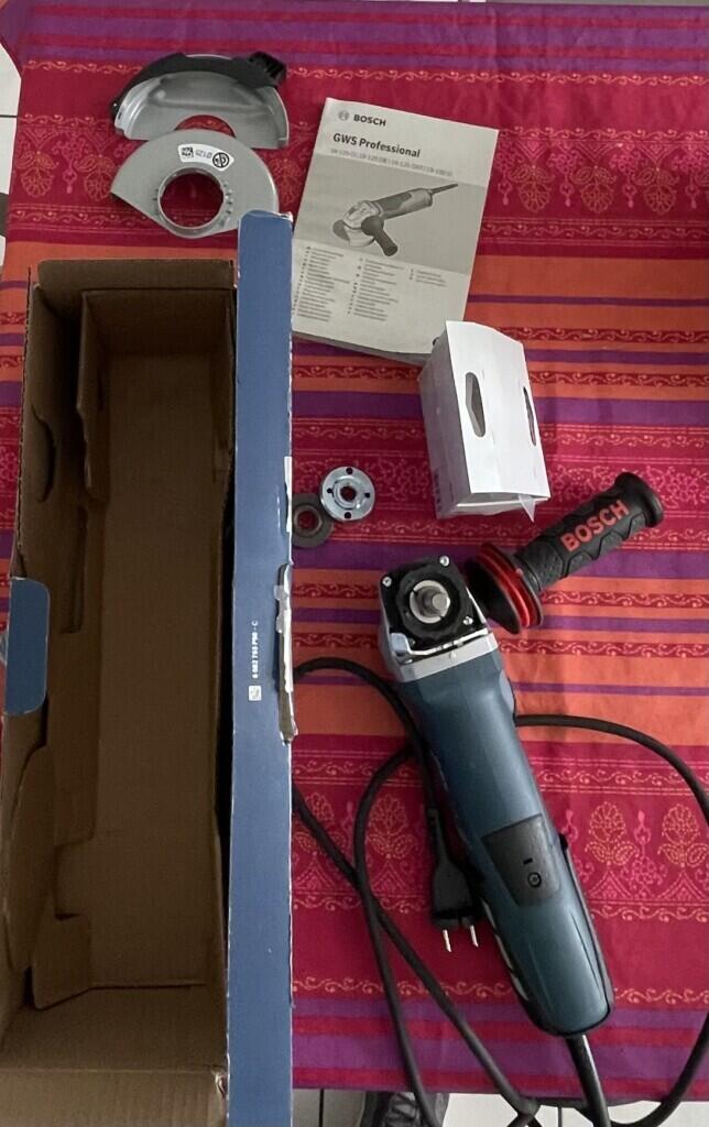 Meuleuse avec poignée, et clé de serrage et double carter de protection. Puisqu’a chacun son besoin spécifique, libre à vous d’utiliser vos propres disques , métal ou inox ou béton ou pvc …