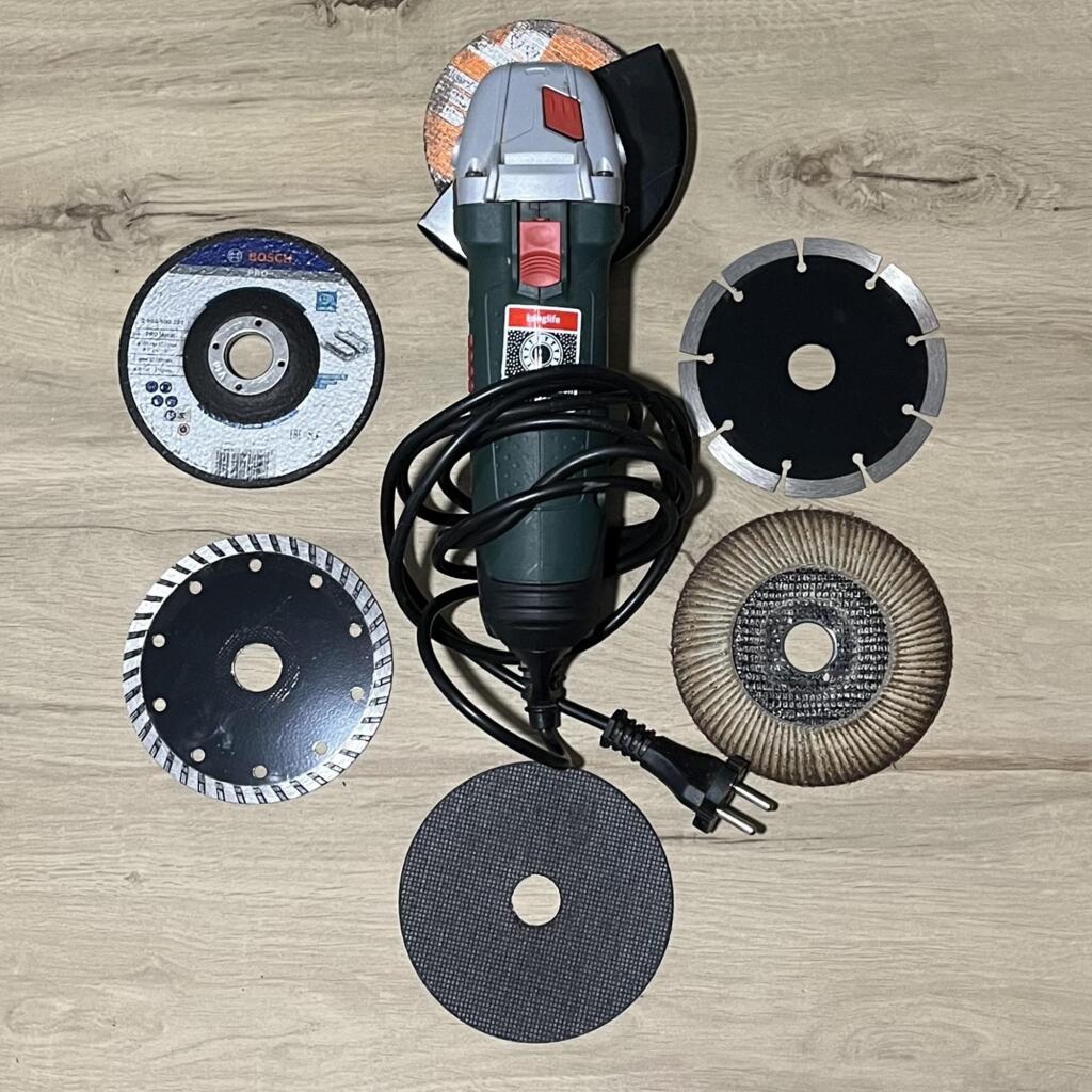 Meuleuse Bosch, je fournis avec des disques à tronçonner (métal et autres) de différentes épaisseur, des disques pour couper du béton et un disque pour poncer les surfaces dures.