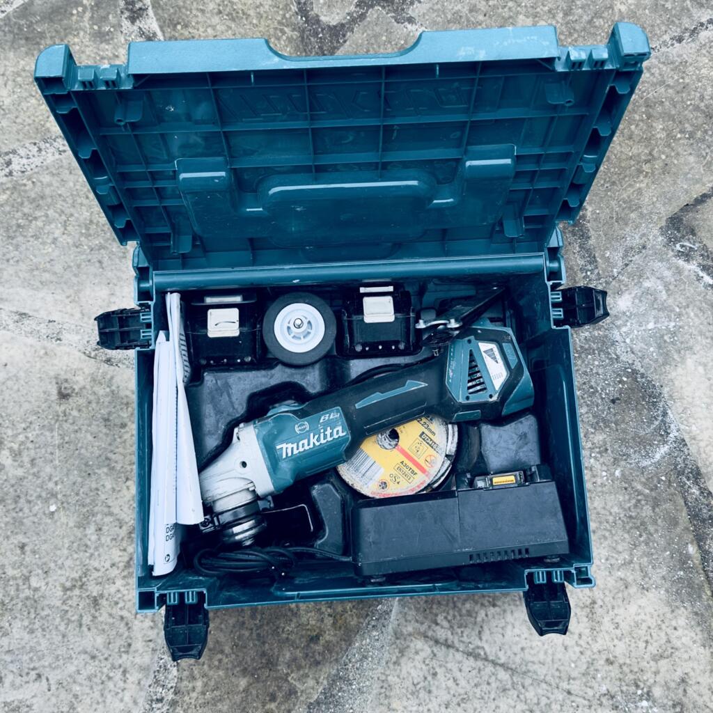 Meuleuse d’angle Makita DGA Brushless 18V Ø mm, matériel professionnel puissant et bien entretenu. Idéale pour métal, béton, disque diamant, multi-matériaux et ébavurage.