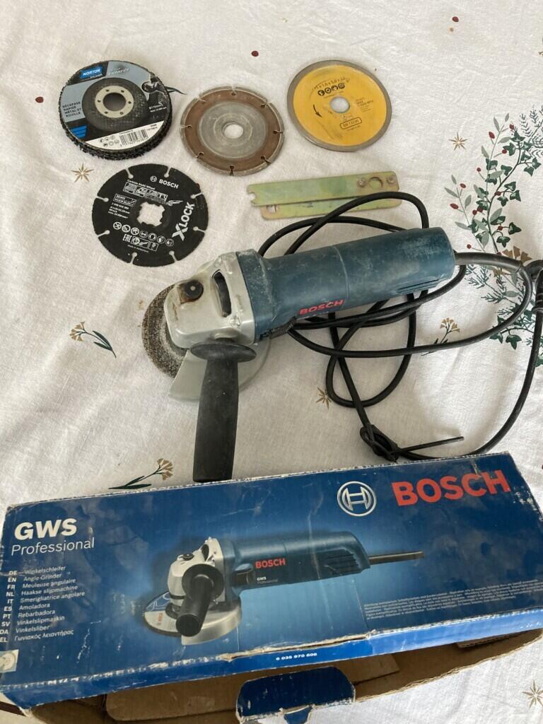 Meuleuse angulaire Bosch, en bon état. Parfait pour découper différents matériaux, mais également décaper le métal rouillé. N’hésitez pas à prendre contact avec moi pour plus de renseignements.