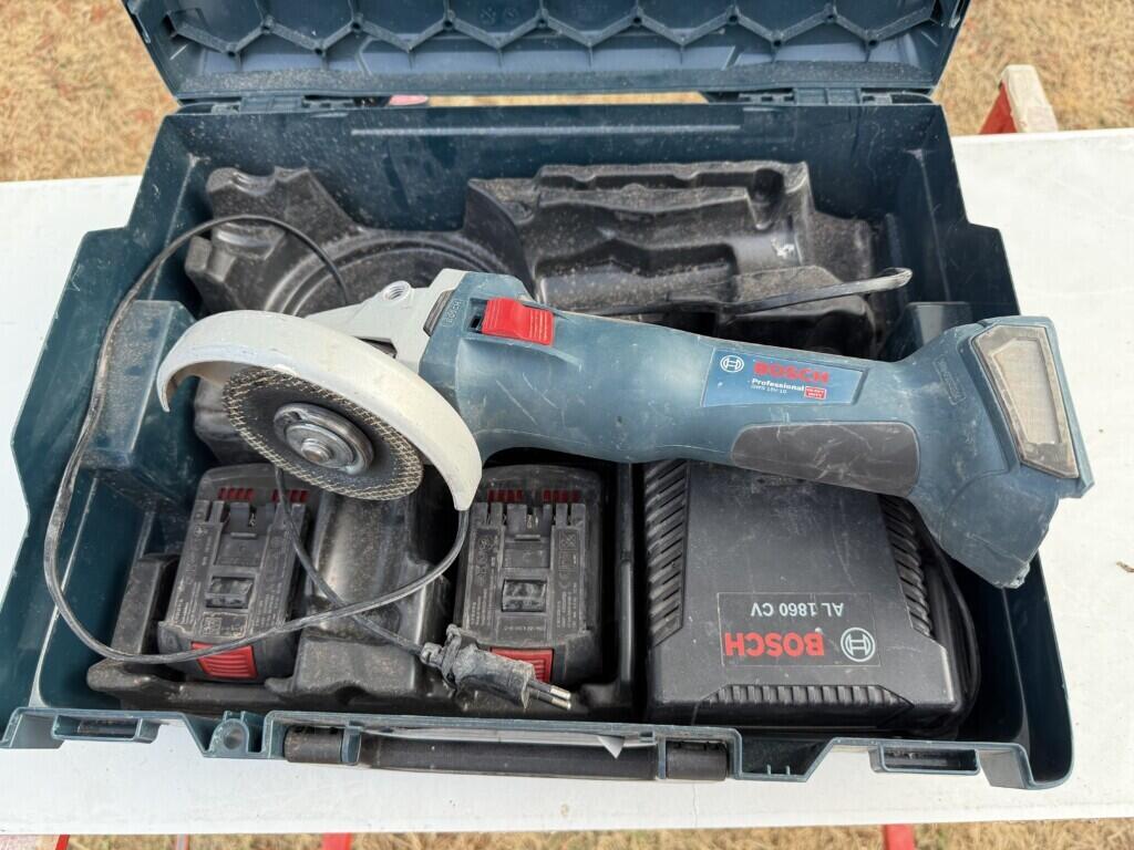 Meuleuse d’angle 125 bosch sur batterie avec bloc de charge et 2 batteries. Dans sa boîte avec clé de serrage rapide, carter, un disque béton et un disque fer.