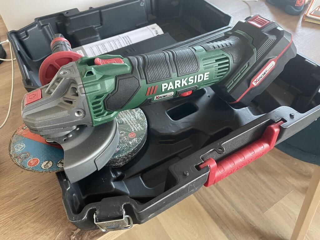 Loué avec plusieurs disques à découper, plusieurs disques à lamelles, batterie 4 ampère/heures, chargeur et palette de transport.