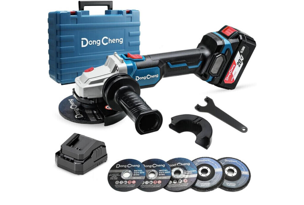 DongCheng Meuleuse d'angle sans fil 18 V, Ø de disque125 mm, 630 W, profondeur de coupe 33 mm, Meuleuse augulaire sans balais Poignée anti-vibration, Couvercle à dégagement rapide avec batterie 4.0Ah