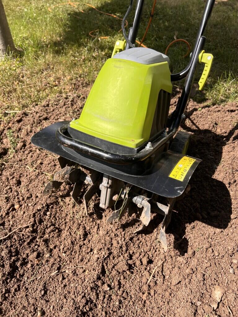 C’est une motobineuse de marque Progreen équipée d’un moteur de 1400 w, les roues peuvent se rabattre très rapidement et elle peut être pliée pour être transportée facilement.