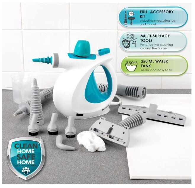 De marque Beldray : Nettoyeur Vapeur électrique à Main 10-en-1 , Prise EU, Nettoyage et Désinfection Vapeur Multifonctionnel, Réservoir d’Eau de 250ml, Accessoires Nettoyage pour Rideaux, Salle de Bain, Cuisine etc, 1000W.