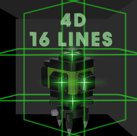 Niveau laser vert 4D. Le niveau laser produit 16 lignes laser, 8 lignes horizontales, 8 lignes verticales et 10 lignes transversales, ce qui facilite le collage au sol, au plafond et les travaux de plâtrage. La ligne laser peut être modifiée en fonction des besoins du travail.