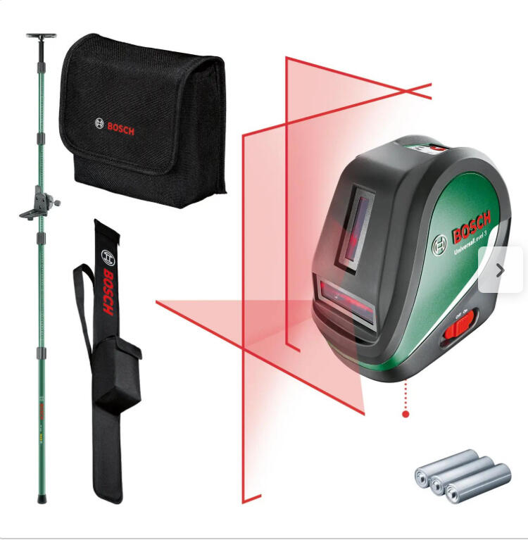Laser lignes UniversalLevel 3 de Bosch avec tige télescopique (3 laser lignes avec ligne verticale à angle de 90° pour une croix laser supplémentaire au plafond et un point d’aplomb inférieur pour des alignements précis, dans boîte carton). L’UniversalLevel 3 Bosch : pour des alignements faciles et des mesures précises. La projection d’une seconde croix laser au plafond permet des alignements faciles et rapides avec une précision de +/- 0,5 mm/m. Projection d’une croix laser, d’une ligne verticale supplémentaire à 90° et d’un point d’aplomb vers le bas. La tige télescopique fournie permet une utilisation mobile à différentes hauteurs. Fonction d’inclinaison pour travailler en dehors de la plage d’auto-nivellement avec des lignes laser obliques.