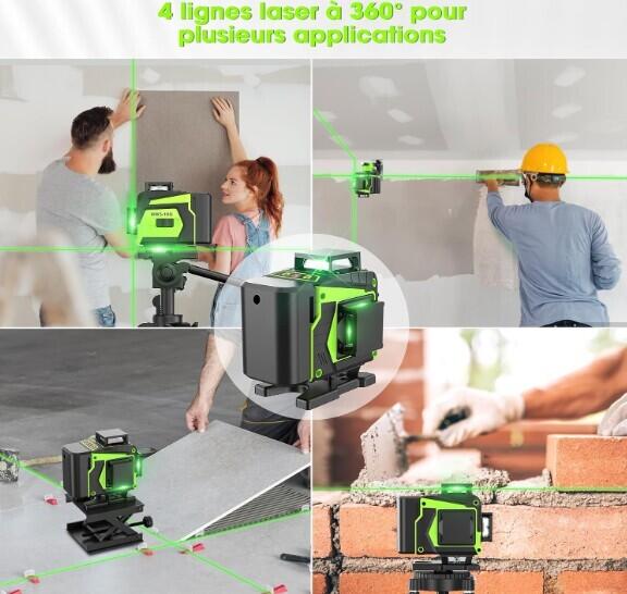Niveau Laser Chantier Autonivelant 360° x 4, Lazer Niveaux 4D 16 Lignes Laser, Autonivellement et Mode Pulsé Extérieur, 2 x Batterie