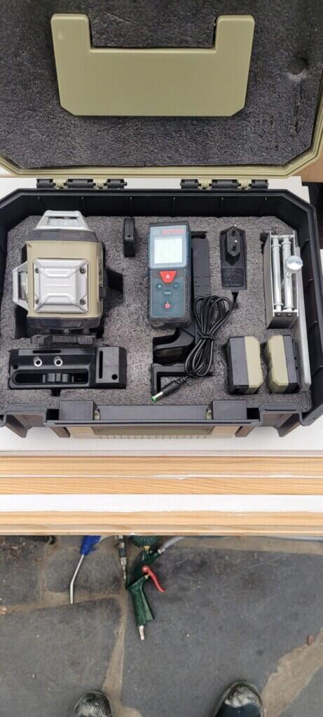 Niveau laser sur batterie avec différents accessoires. À rendre propre cordialement