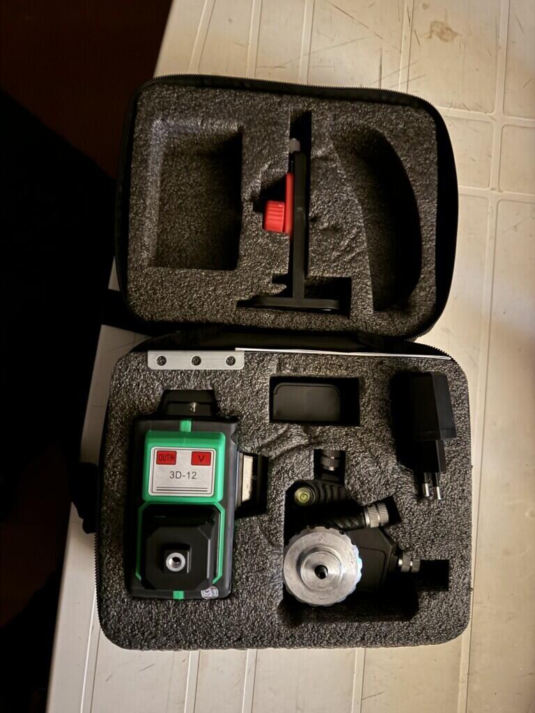 Pied pour le poser à terre ou pattes pour le suspendre chargeur secteur et deux batteries et sa pochette de transport.