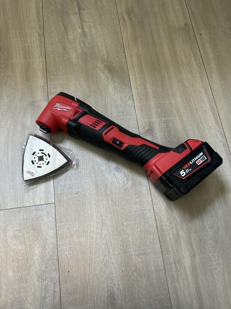 Multitool, outil multifonction sur batterie, 50 A 18 V avec différents outils de ponçage. Très maniable et permet d’atteindre des recoins.