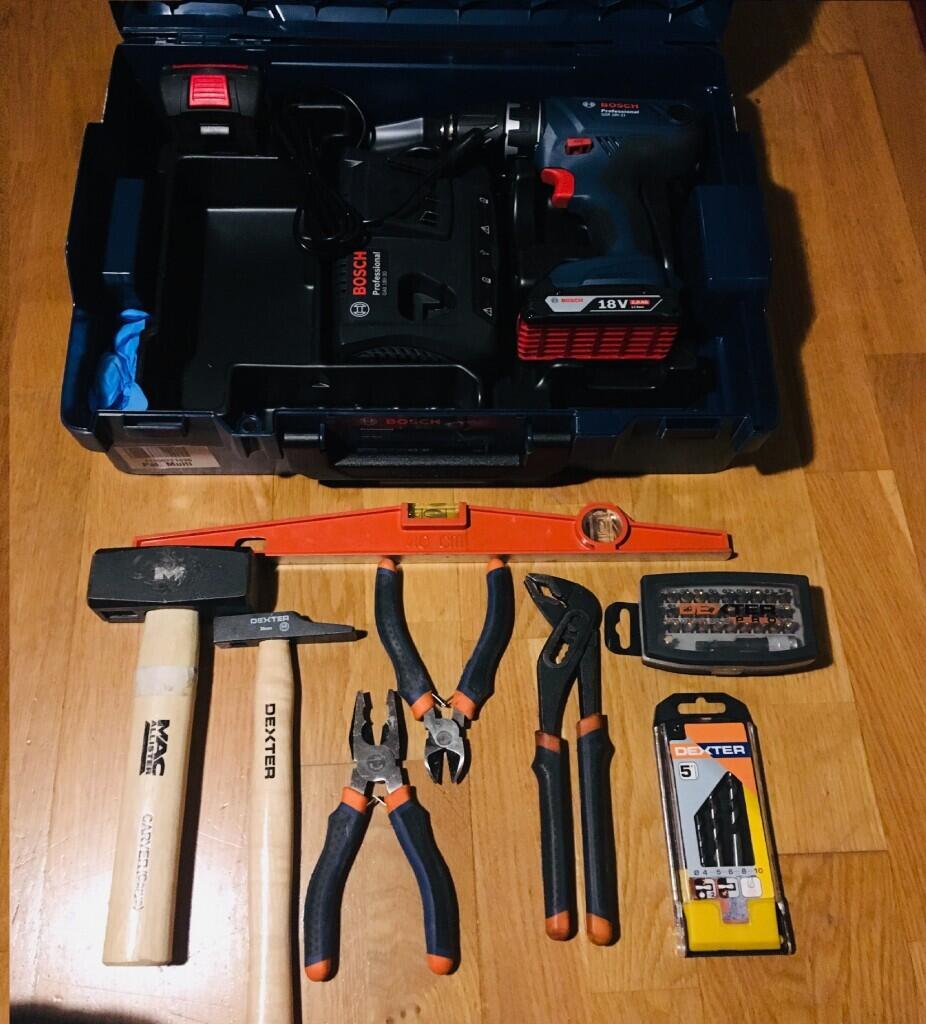 Je mets en location un pack perçage qui comprend une perceuse visseuse Bosch Pro comportant deux batteries, un lot de 32 embouts, un coffret de 5 forêts béton, 4 pinces (multiprise, coupante, universelle, cheville métal), deux marteaux et un niveau.