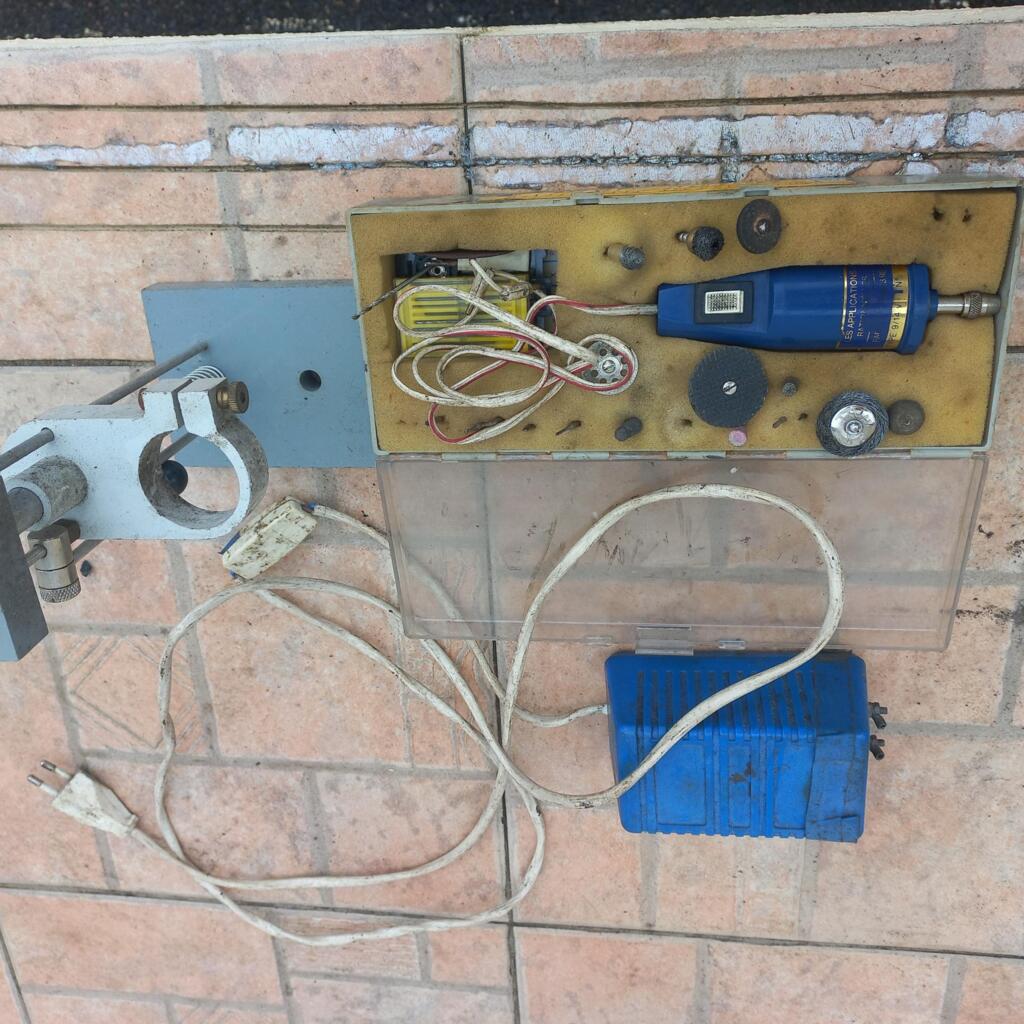 Mini perceuse modélisme avec différents accessoires, pied colonne, transformateur