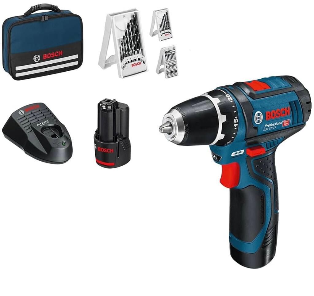 Livré avec (set Amazon Exclusive) : GSR 12V-15, 2 batteries 2,0 Ah, set d’accessoires 39 pièces (25 embouts de vissage, 7 mèches à bois, 7 forets à métaux), chargeur, sacoche d’outils