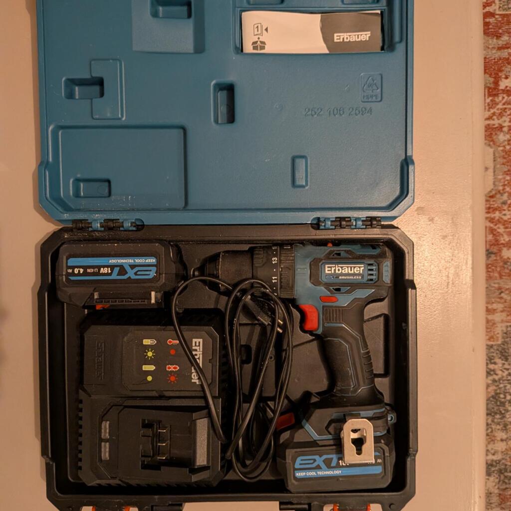 Perceuse 18v 4Ah avec deux batteries et son chargeur de batterie.