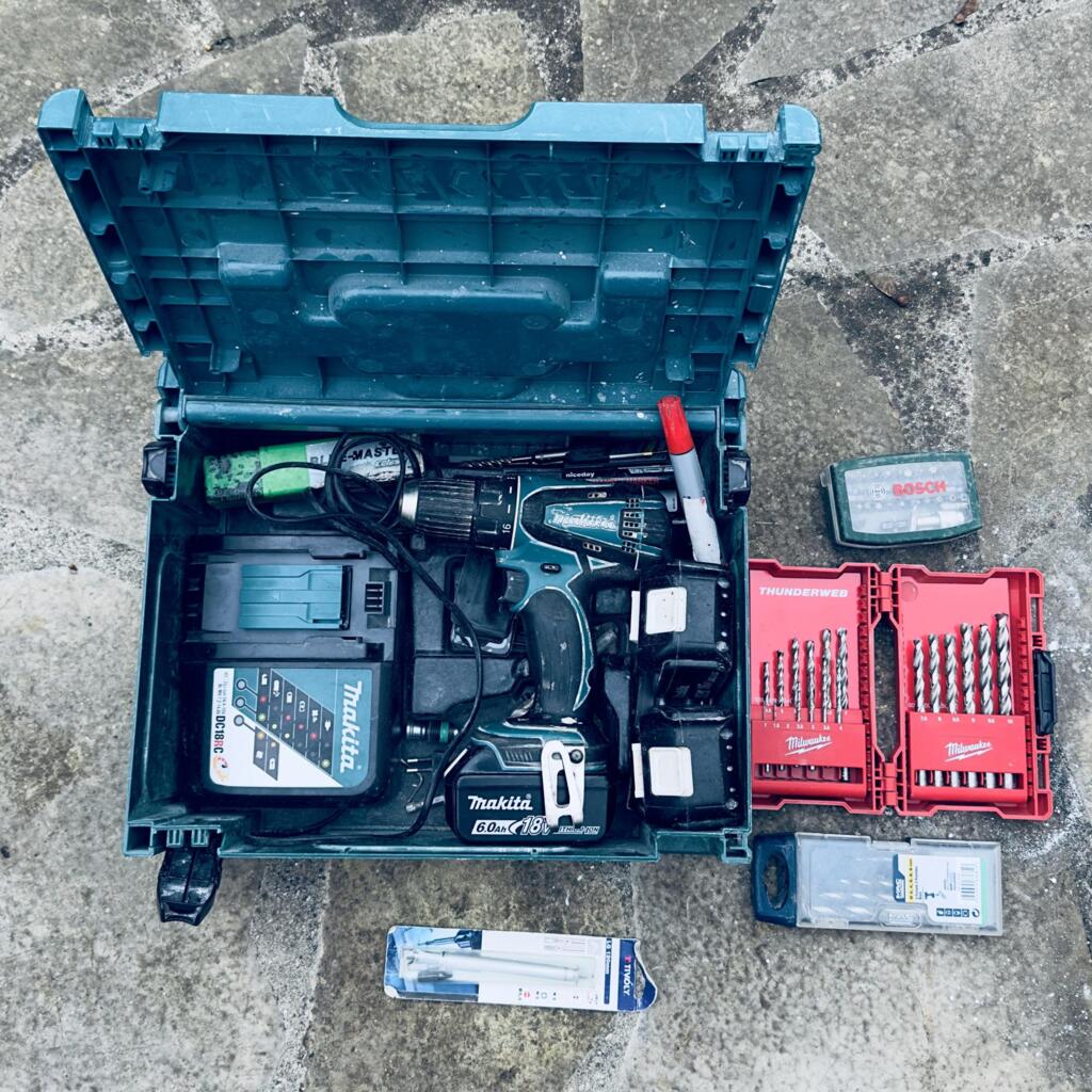 Perceuse/visseuse Makita 18V, livrée avec une batterie 6.0Ah et un chargeur rapide DC18RC. Idéale pour bois, métal, placo et montage. Matériel professionnel bien entretenu.