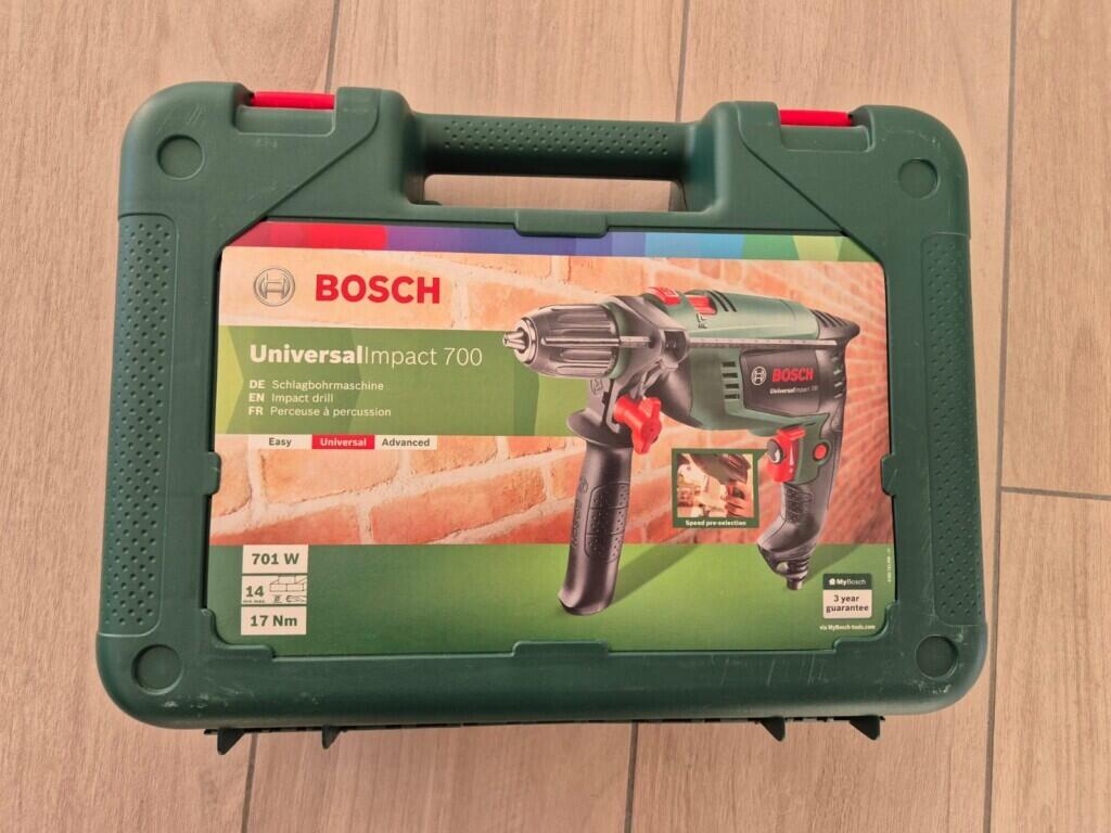 Perceuse a percussion Bosch UniversalImpact 700. Légere et compacte, la perceuse est particulierement maniable. Tres bonnes performances de perçage pour un maximum de polyvalence. Puissant moteur de 700 W pour toutes les applications. Diametre de perçage de 30 mm. Matériaux a travailler : Béton. Tension de 230 V.