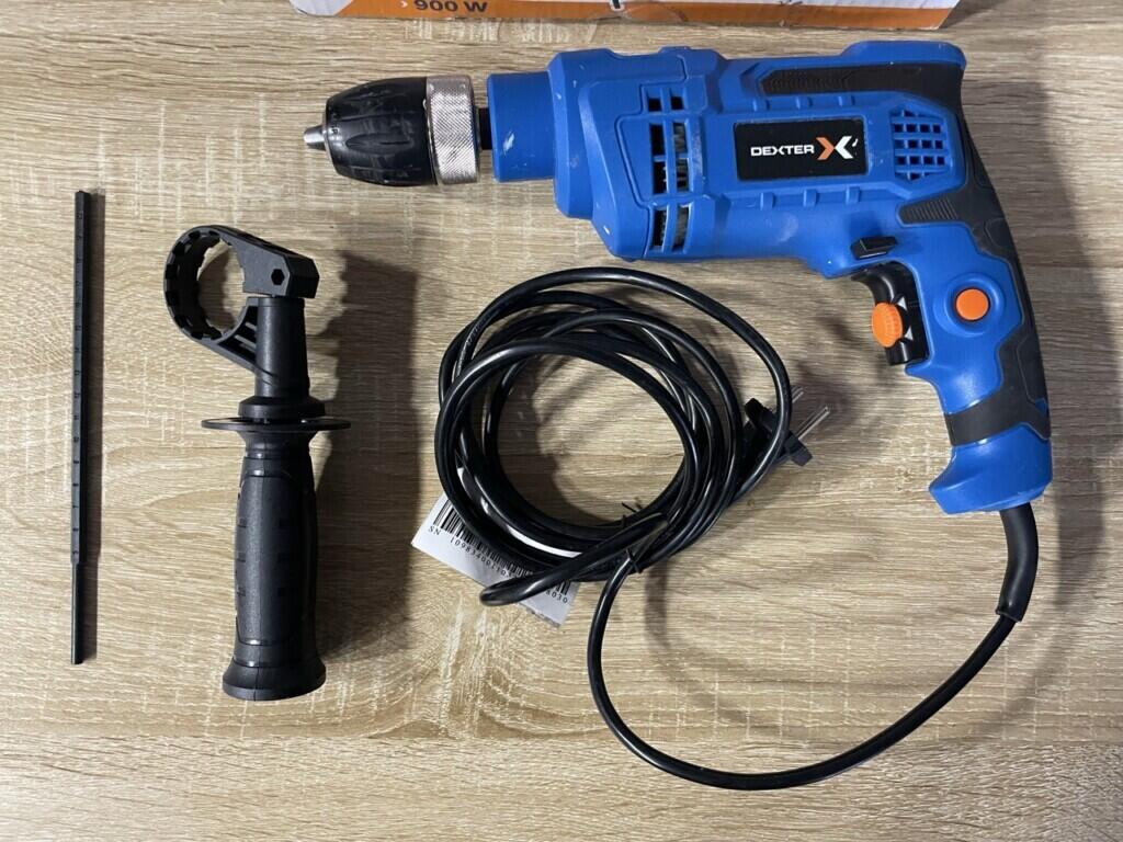 Perceuse à percussion Dexter de 900W. Utilisez quelques fois pour rénovation appartement. Fournie avec sa boite et poignée auxiliaire. Mandrin automatique. Sélecteur de rotation. Sélecteur de vitesse. Butée de profondeur. Fournie sans mèches.