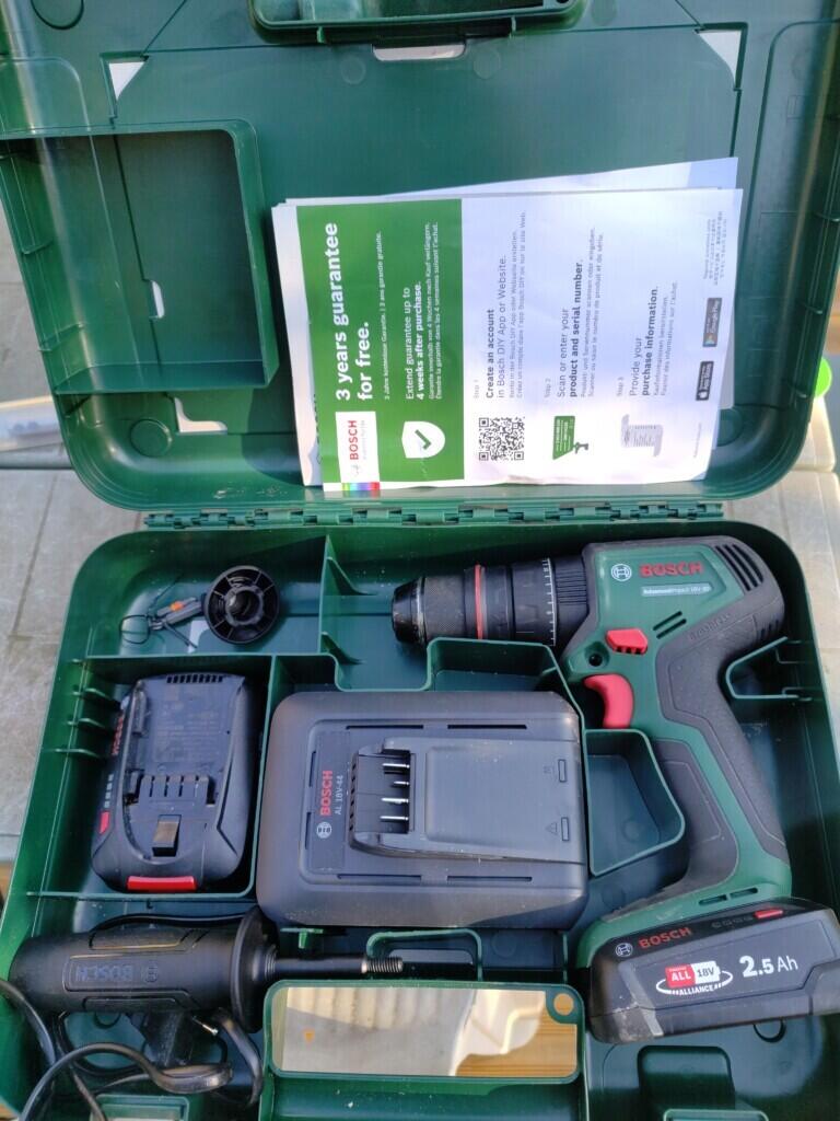 Perceuse-visseuse sans fil avec chargeur et de batterie 18 volts 2,5 ampères heure. Avec deux embouts visseurs. Vous pouvez louer embouts et forêts séparément.