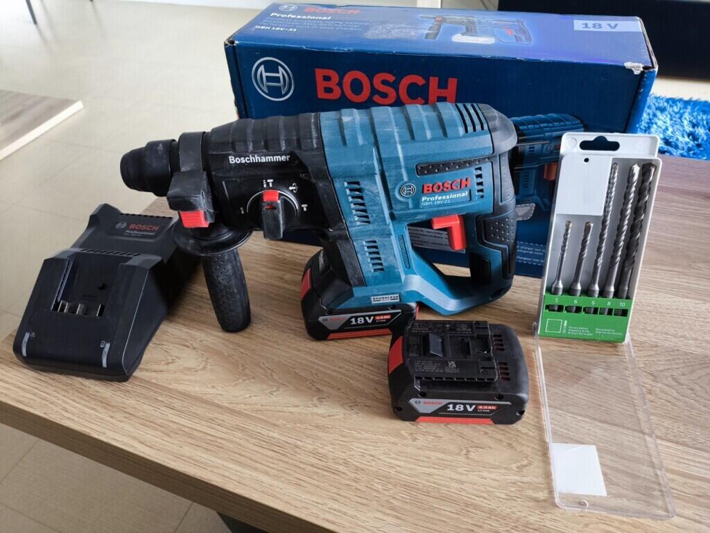 Perceuse à percussion BOSCH PRO à votre disposition avec un set de foret à béton (de 5 à 10), un jeu de 2 batteries et le chargeur.