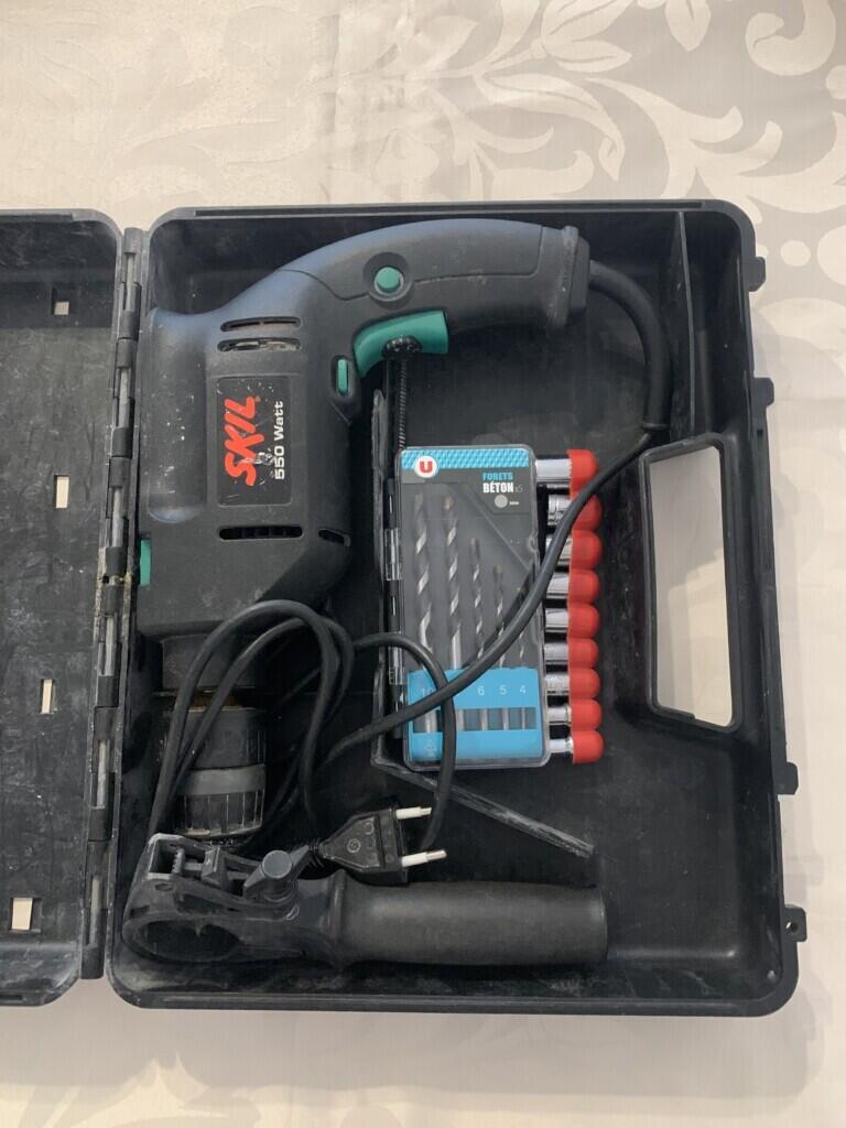 Perceuse à percussion ou non donc peut servir de visseuse. J’ai un ensemble de forets, d’embouts, à vous proposer en fonction de vos attentes. (Forets béton, bois, métal et un bon stock d’embouts). Dispose d’un manche pour un meilleur appui et d’une règle pour la profondeur.