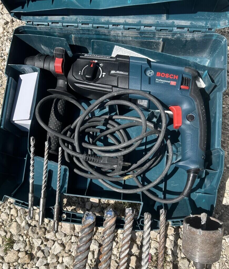 Plusieurs mèches dont scie cloche béton 68mm et accessoires (burin, mandrin à vis) disponible.