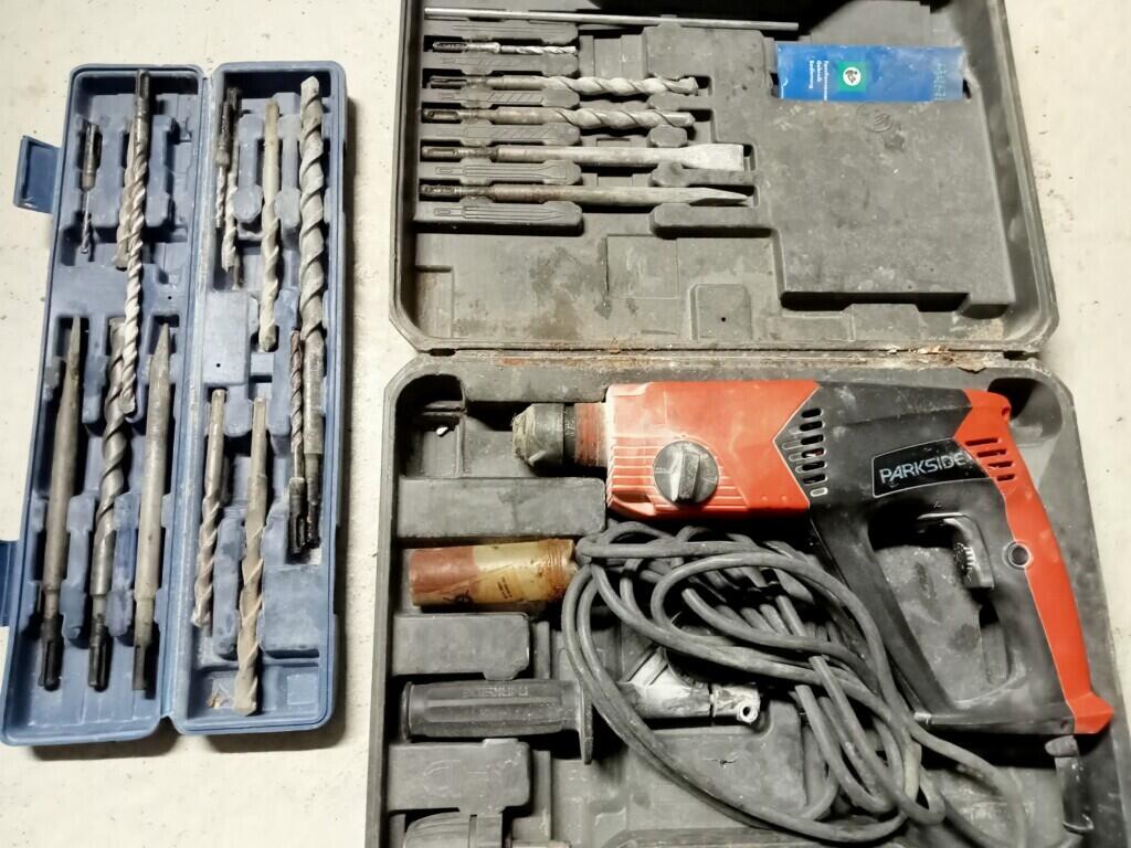 Perforateur burineur électrique avec différents forêts de différentes dimensions et utilisation, idéal pose rail cloison placoplâtre, perçage pour passage tuyau plomberie, dépose ancien revêtement carrelage, faïence…