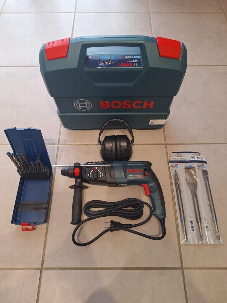 Loue perforateur Bosch GBH 2-26 avec kit complet (forets béton5, 6, 8, 10, 12, burins, casque,lunette de protection) pour travailler en toute sécurité et efficacité.