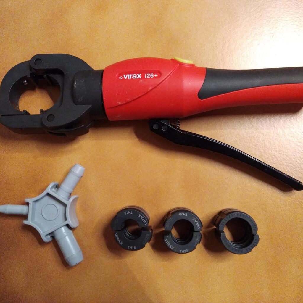 je propose en location une pince à sertir professionnelle Virax i26+ avec les mâchoires en profil TH associées (diamètres 16, 20 et 26).