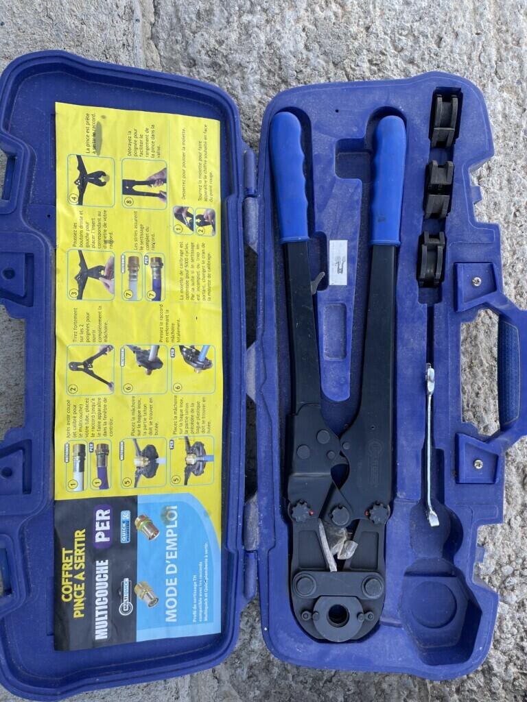 Je propose à la location un coffret pince à sertir manuel, compatible avec les raccords Multicouche et PER, profils de sertissage TH (standard le plus courant).