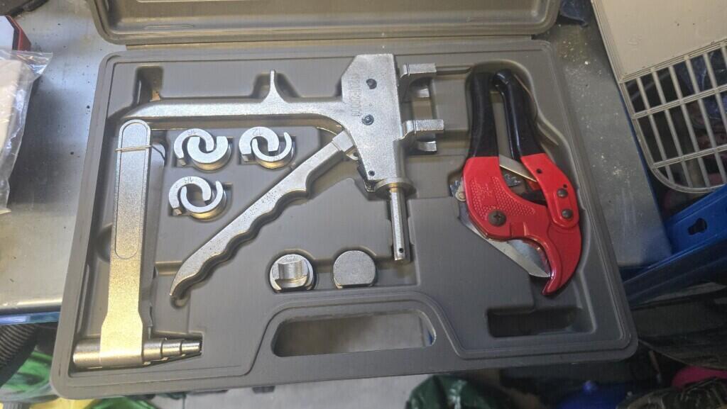 Coffret complet comprenant : une pince coupe tube, une pince à évaser, une pince à glissement, 2 embouts butoirs et 3 paires d'adaptateurs de diamètres
