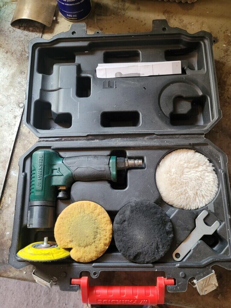 Polisheuse parkside en état neuf, évidemment les mousses sont un peu marquées mais jouent bien leur rôle.