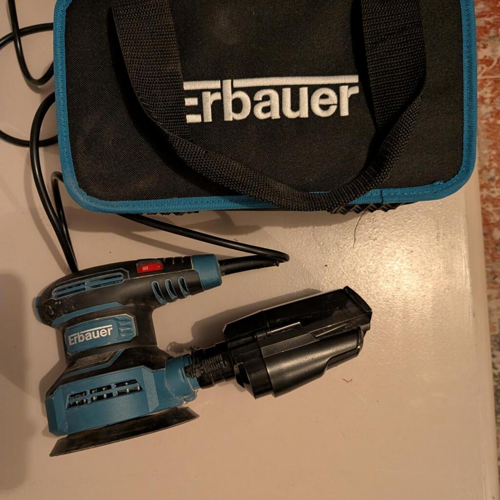 Ponceuse excentrique avec son sac, ses accessoires(notamment un récupérateur de poussières) et la notice.