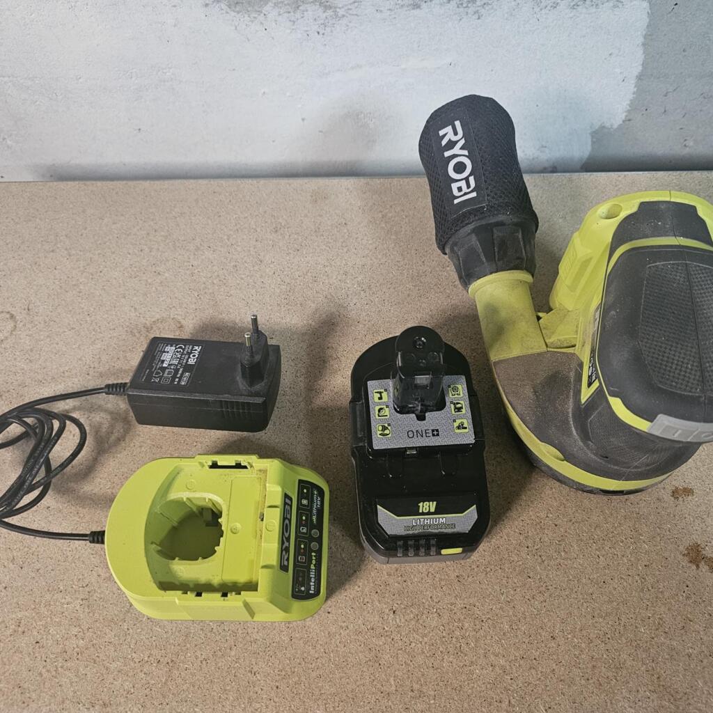 Ponceuse excentrique 18V ONE+ avec une batterie et un chargeur.