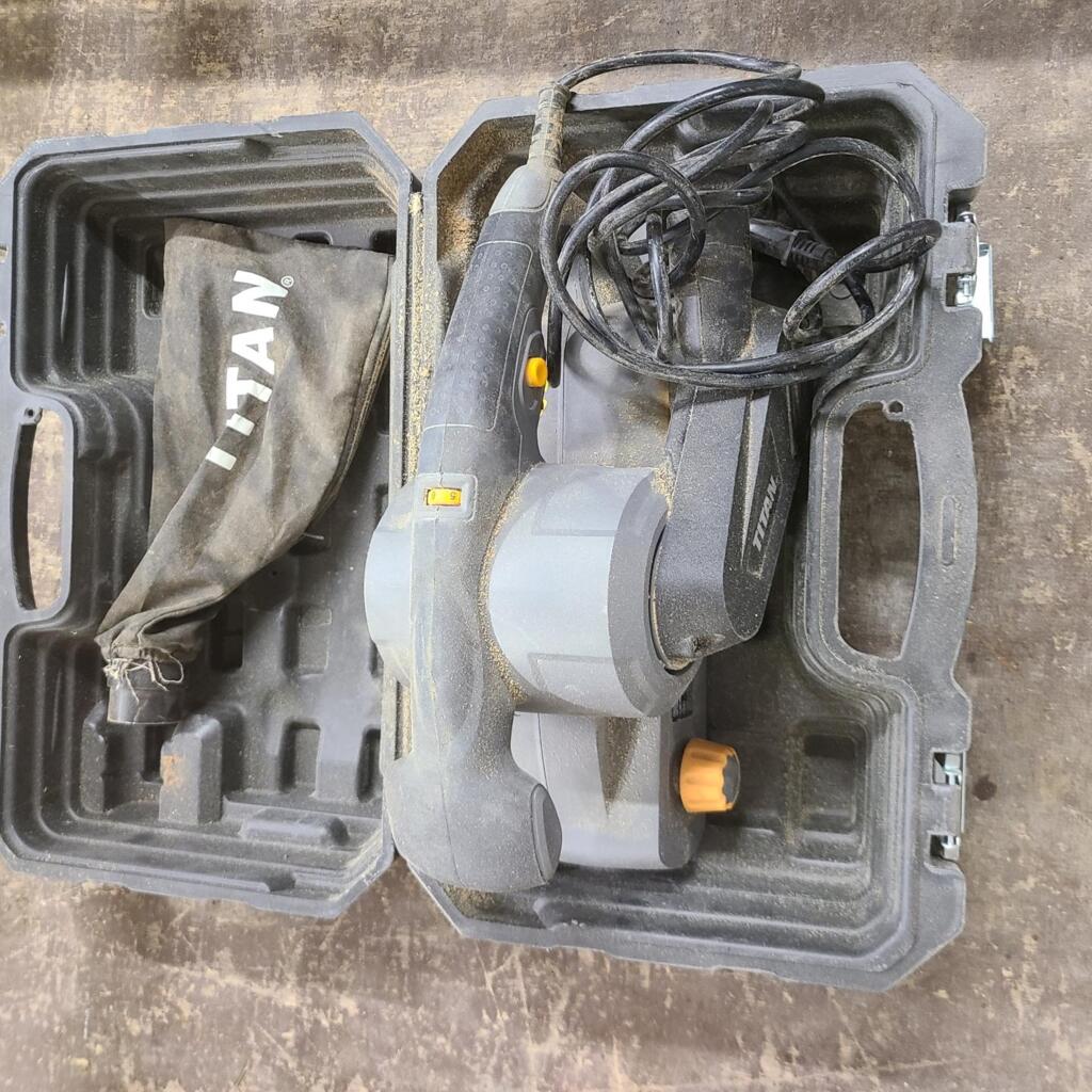 Ponceuse à bande Titan de 76xmm avec sac ou embout aspirateur. Mollette de réglage pour la vitesse de 1 à 6. Pas de papier fournie.