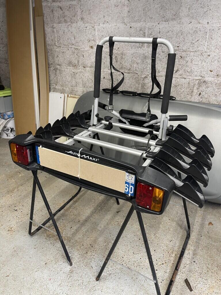 d’une capacité de 4 vélos . Se monte sur la boule d’attelage de votre véhicule . Bon état général et adapté pour vélos de petites ou de grandes tailles . La location comprend le porte vélo ainsi que ses sangles d’attaches .