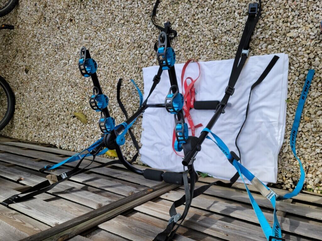Je loue un porte vélo décathlon sur hayon, ajustable en fonction du modèle du véhicule.
