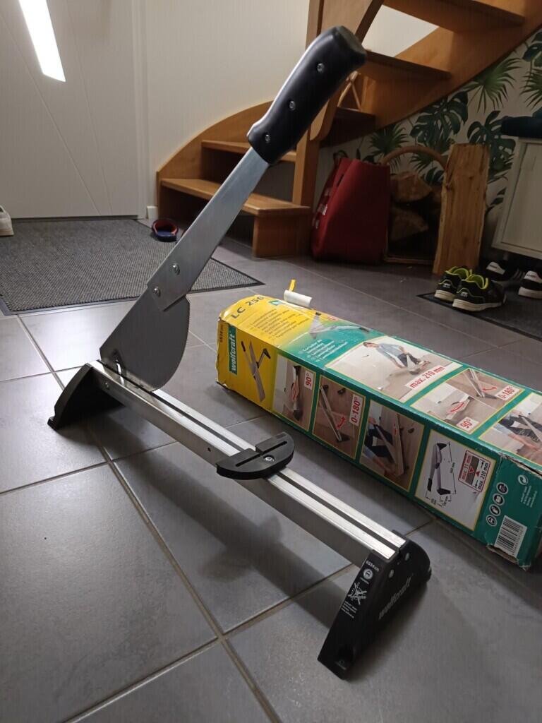 Presse coupante pour sols stratifiés faisant 21 cm de largeur maximum et 10 mm d’épaisseur maximum.