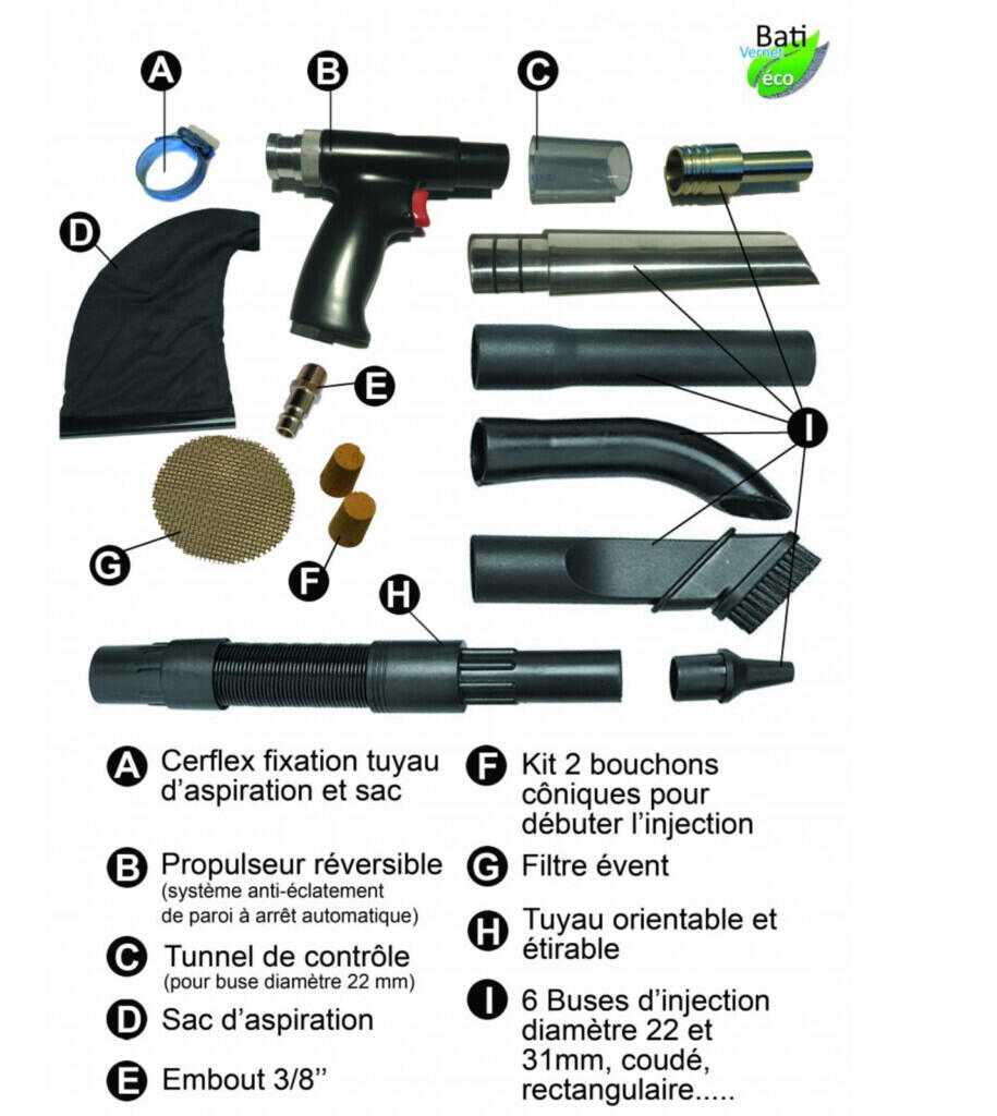Propulseur d insufflation ou d’injection de bille isolante en vrac, type polystyrène, billegraphite et bille de liège. Kit complet avec tuyau et plusieurs buses de diamètre 32 mm et 22 mm, avec guide d’utilisation. Fonctionne à ce un compresseur à air comprimé de 150 à 300 l/ min sous 8 bars.