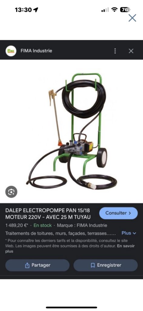 Pulvérisateur professionnel pour toiture, 25 m de tuyau. Selon le produit utilisé le produit à une portance de 5 m. Donc possibilité de ne pas monter sur la toiture pour faire demoussage toiture prix intéressant.