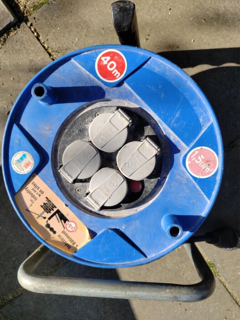 Rallonge électrique sur enrouleur de 40 m avec 4 prises isolées.