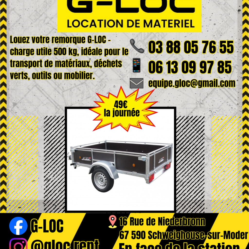 Louez votre remorque G-LOC – charge utile kg, idéale pour le transport de matériaux, déchets verts, outils ou mobilier.
